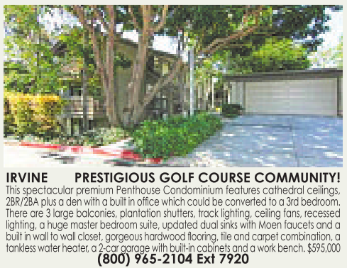 IRVINE PRESTIGIOUS GOLF COURSE COMMUNITY! This spectacular premium Penthouse Condominium features cathedral ceilings, 2BR/2BA plus aden with abuilt in office which could be converted to a3rd bedroom. There are 3large balconies, plantation shutters, track lighting, ceiling fans, recessed lighting, ahuge master bedroom suite, updated dual sinks with Moen faucets and abuilt in wall to wall closet, gorgeous hardwood flooring, tile and carpet combination, atankless waterheater,a2-car garage with built-in cabinets and awork bench. $595,000 (800) 965-2104 Ext 7920