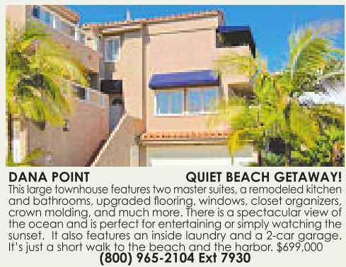 DANA POINT QUIET BEACH GETAWAY! This large townhouse features two master suites, aremodeled kitchen and bathrooms, upgraded flooring, windows, closet organizers, crown molding, and much more. Thereisaspectacular viewof theocean andisperfect forentertaining or simply watching the sunset. It also features an inside laundry and a2-car garage. It’s just ashort walk to the beach and the harbor. $699,000 (800) 965-2104 Ext 7930 See also