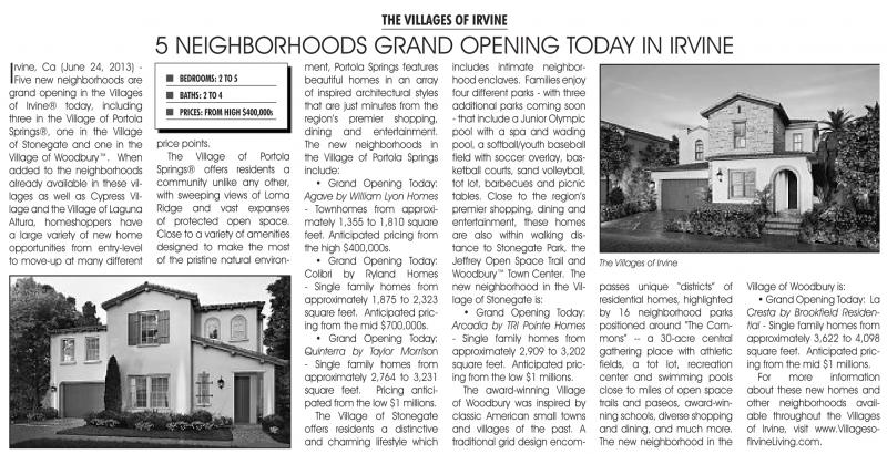 Ca (June 24, 2013) - Five new neighborhoods are grand opening in the villages of Irvine® today, including three in the village of Portola Springs®, one in the village of Stonegate and one in the village of Woodbury™. When added to the neighborhoods already available in these villages as well as Cypress village and the village of laguna altura, homeshoppers have a large variety of new home opportunities from entry-level to move-up at many different