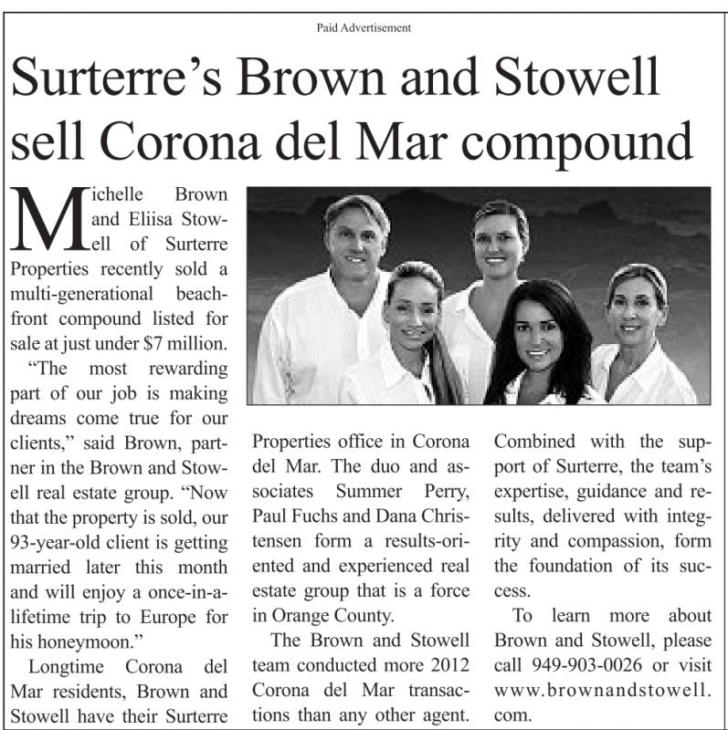 Paid Advertisement Surterre’s Brown and Stowell sell Corona del Mar compound Michelle Brown and Eliisa Stowell of Surterre Properties recently sold a multi-generational beachfront compound listed for sale at just under $7 million. “The most rewarding part of our job is making dreams come true for our clients,” said Brown, partner in the Brown and Stowell real estate group. “Now that the property is sold, our 93-year-old client is getting married later this month and will enjoy a once-in-alifetime trip to Europe for his honeymoon.” Longtime Corona del Mar residents, Brown and Stowell have their Surterre Properties office in Corona del Mar. The duo and associates Summer Perry, Paul Fuchs and Dana Christensen form a results-oriented and experienced real estate group that is a force in Orange County. The Brown and Stowell team conducted more 2012 Corona del Mar transactions than any other agent. Combined with the support of Surterre, the team’s expertise, guidance and results, delivered with integrity and compassion, form the foundation of its success. To learn more about Brown and Stowell, please call 949-903-0026 or visit www.brownandstowell. com. See also