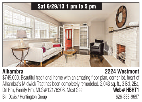 Sat 6/29/13 1pmto5pm Alhambra 2224 Westmont $749,000. Beautiful traditional home with an amazing floor plan, corner lot, heartof Alhambra’s Midwick Tract has been completely remodeled. 2,043 sq. ft., 3Bd, 2Ba, Dn Rm, Family Rm, MLS#12176308. Most See! Web# HBHT1 Bill Davis /Huntington Group 626-833-9697