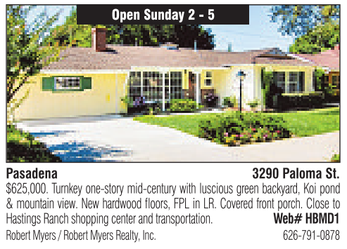 Open Sunday 2-5 Pasadena 3290 Paloma St. $625,000. Turnkey one-story mid-century with luscious green backyard, Koi pond &mountain view. New hardwood floors, FPL in LR. Covered front porch. Close to Hastings Ranch shopping center and transportation. Web# HBMD1 RobertMyers /RobertMyers Realty,Inc. 626-791-0878
