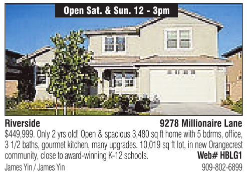 Open Sat. &Sun. 12 -3pm Riverside 9278 Millionaire Lane $449,999. Only 2yrs old! Open &spacious 3,480 sq ft home with 5bdrms, office, 31/2 baths, gourmet kitchen, many upgrades. 10,019 sq ft lot, in new Orangecrest community,close to award-winning K-12 schools. Web# HBLG1 James Yin /James Yin 909-802-6899