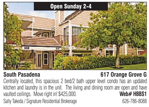 Open Sunday 2-4 South Pasadena 617 Orange Grove G Centrally located, this spacious 2bed/2 bath upper level condo has an updated kitchen and laundry is in the unit. The living and dining room are open and have vaulted ceilings. Move right in! $425,000. Web# HBBS1 Sally Takeda /SignatureResidential Brokerage 626-786-8088