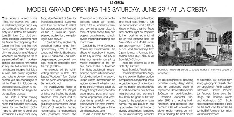 beauty is indeed a rare find. Homebuyers who aspire to residential prestige and luxury are destined to find the opportunity of a lifetime this Saturday, June 29th from 10 a.m. to 6p.m. when Brookfield residential hosts the model Grand opening of La Cresta, the finest and final new home offering within the Village of Irvine’s award-winning Village of woodbury. Be among the first to experience La Cresta’s model residences and discover new homes so exquisite,itwill redefine the way homebuyers imagine their future in Irvine. with priority registration and sales underway, interested homebuyers are encouraged to visit La Cresta this Saturday, log onto BrookfieldSoCal.com to register their interest and begin the pre-qualifying process.