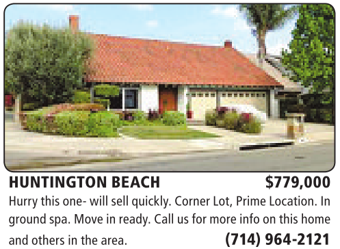 HUNTINGTON BEACH $779,000 Hurrythis one-will sell quickly.Corner Lot, PrimeLocation. In groundspa. Move in ready. Call us formore infoonthis home andothersinthe area. (714) 964-2121