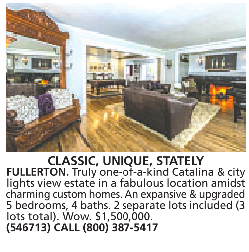 CLASSIC, UNIQUE, STATELY FULLERTON. Truly one-of-a-kind Catalina &city lights view estate in afabulous location amidst charming custom homes. An expansive &upgraded 5bedrooms, 4baths. 2separate lots included (3 lots total). Wow. $1,500,000. (546713) CALL (800) 387-5417