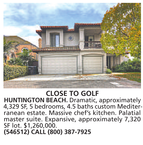 CLOSE TO GOLF HUNTINGTON BEACH. Dramatic, approximately 4,329SF, 5bedrooms, 4.5 baths custom Mediterranean estate. Massive chef’s kitchen. Palatial master suite. Expansive, approximately 7,320 SF lot. $1,260,000. (546512) CALL (800) 387-7925