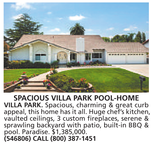 SPACIOUS VILLA PARK POOL-HOME VILLA PARK. Spacious, charming & great curb appeal, this home has it all. Huge chef’skitchen, vaulted ceilings, 3 custom fireplaces, serene & sprawling backyard with patio, built-in BBQ & pool. Paradise. $1,385,000. (546806) CALL (800) 387-1451