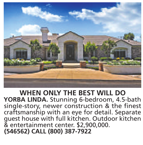 WHEN ONLY THE BEST WILL DO YORBA LINDA. Stunning 6-bedroom, 4.5-bath single-story, newer construction & the finest craftsmanship with an eye for detail. Separate guesthouse with full kitchen. Outdoor kitchen & entertainment center. $2,900,000. (546562) CALL (800) 387-7922
