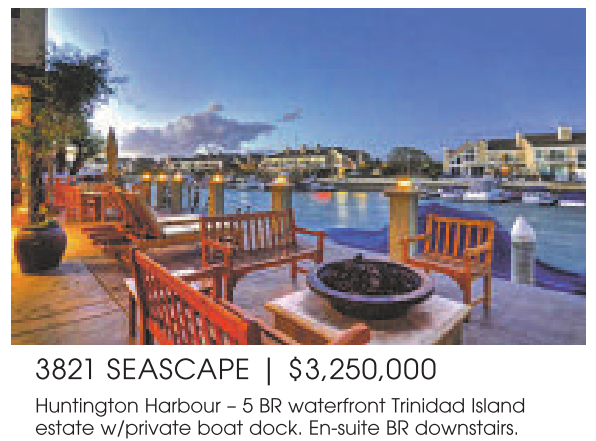 Huntington Harbour – 5 BR waterfront Trinidad Island estate w/private boat dock. En-suite BR downstairs.