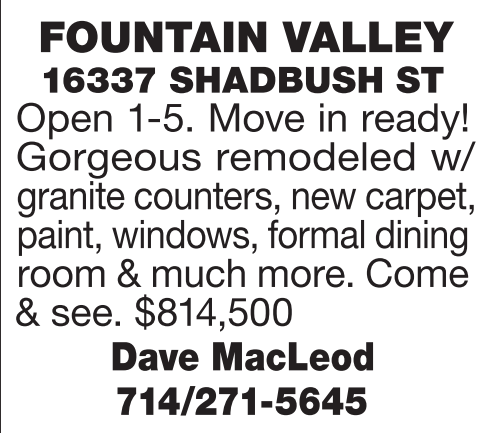 Open 1-5. Move in ready! Gorgeous remodeled w/ granite counters, new carpet, paint, windows, formal dining room & much more. Come & see. $814,500 Dave MacLeod 714/271-5645