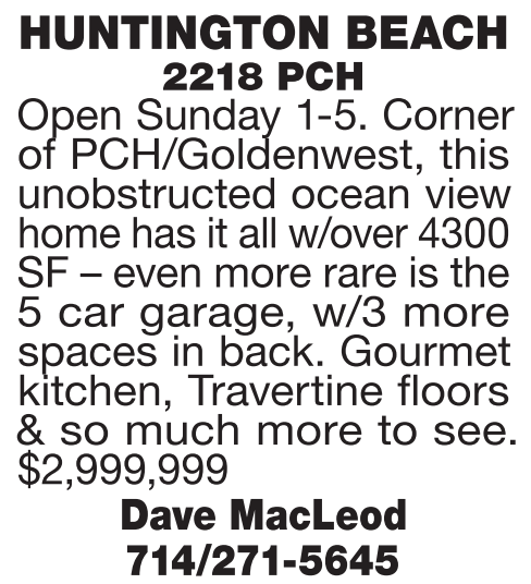 Open Sunday 1-5. Corner of PCH/Goldenwest, this unobstructed ocean view home has it all w/over 4300 SF – even more rare is the 5 car garage, w/3 more spaces in back. Gourmet kitchen, Travertine floors & so much more to see.