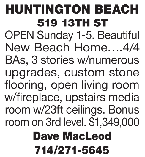 OPEN Sunday 1-5. Beautiful New Beach Home….4/4 BAs, 3 stories w/numerous upgrades, custom stone flooring, open living room w/fireplace, upstairs media room w/23ft ceilings. Bonus room on 3rd level. $1,349,000 Dave MacLeod 714/271-5645