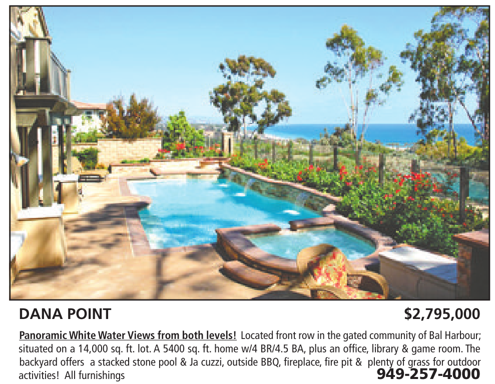 DANA POINT $2,795,000 Panoramic White Water Views from both levels! Located front row in the gated community of Bal Harbour; situated on a 14,000 sq. ft. lot. A 5400 sq. ft. home w/4 BR/4.5 BA,plus an office,library & game room. The backyard offers a stacked stone pool & Ja cuzzi, outside BBQ,fireplace,fire pit & plenty of grass for outdoor activities! All furnishings 949-257-4000