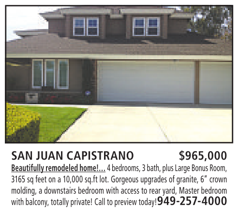 SAN JUAN CAPISTRANO $965,000 Beautifullyremodeled home!… 4bedrooms,3bath, plus Large Bonus Room, 3165 sq feet on a10,000 sq.ft lot. Gorgeous upgrades of granite, 6”crown molding, adownstairs bedroom with access to rear yard, Master bedroom with balcony, totally private! Calltopreview today!949-257-4000