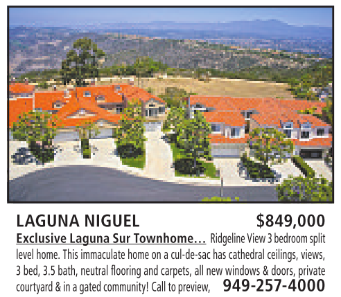 LAGUNA NIGUEL $849,000 Exclusive Laguna SurTownhome… Ridgeline View 3bedroomsplit level home. This immaculate home on acul-de-sac has cathedral ceilings, views, 3bed, 3.5 bath, neutral flooring and carpets, all new windows &doors, private courtyard&inagated community! Call to preview, 949-257-4000