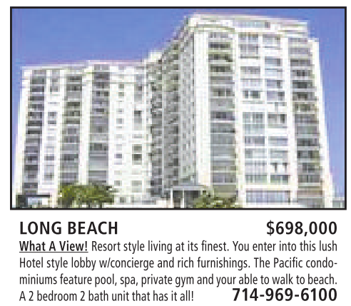 LONG BEACH $698,000 What AView! Resort style living at its finest. You enter into this lush Hotel style lobby w/concierge and rich furnishings. The Pacific condominiums featurepool, spa, private gymand your able to walktobeach. A2bedroom2bathunitthathas it all! 714-969-6100