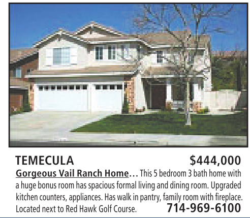 TEMECULA $444,000 GorgeousVailRanch Home… This 5bedroom3bathhome with ahugebonus room hasspacious formal living anddiningroom. Upgraded kitchen counters, appliances. Haswalk in pantry,familyroomwithfireplace. Located next to RedHawkGolf Course. 714-969-6100