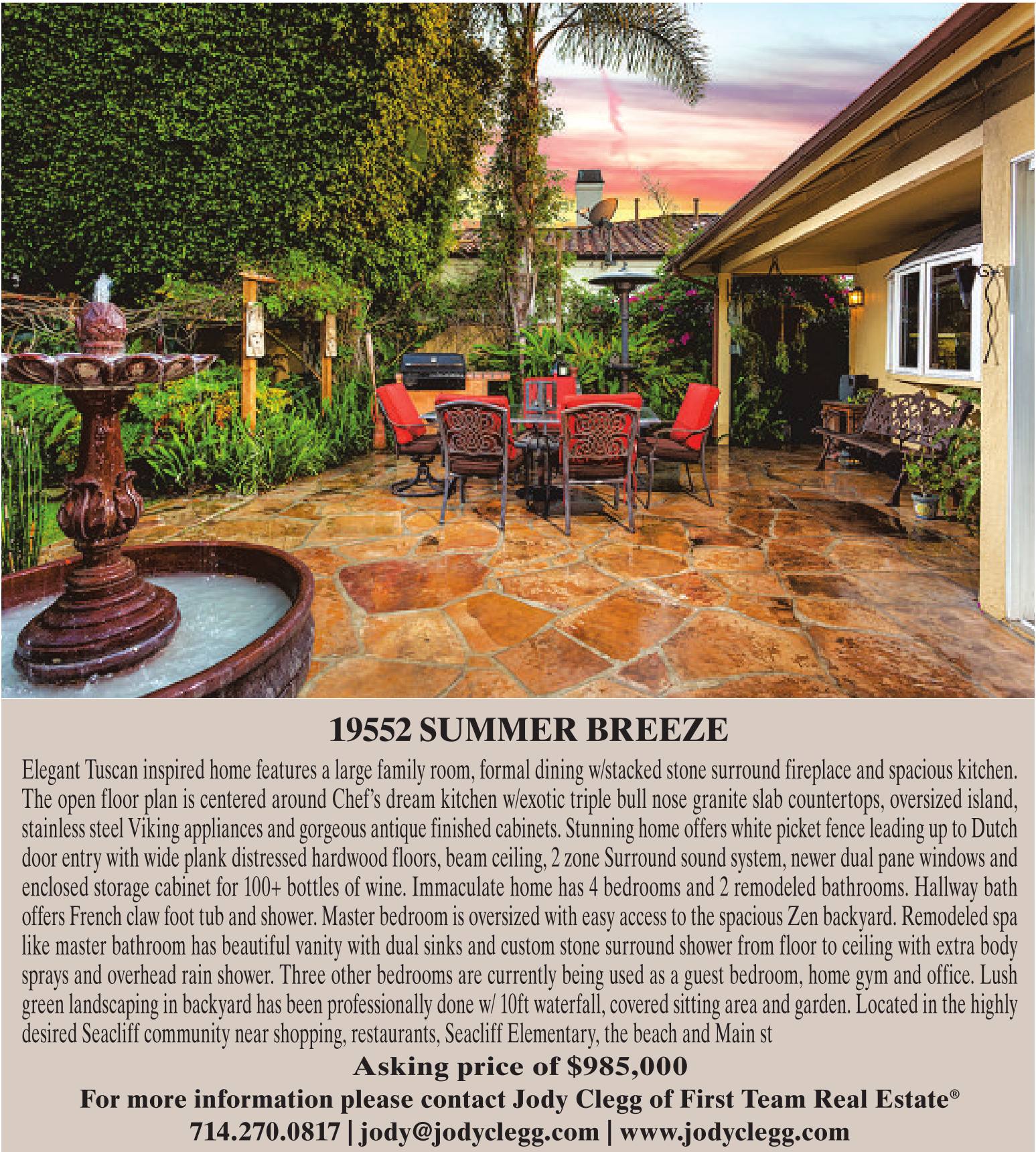 19552 SUMMER BREEZE Elegant Tuscan inspired home features a large family room, formal dining w/stacked stone surround fireplace and spacious kitchen. The open floor plan is centered around Chef’s dream kitchen w/exotic triple bull nose granite slab countertops, oversized island, stainless steel Viking appliances and gorgeous antique finished cabinets. Stunning home offers white picket fence leading up to Dutch door entry with wide plank distressed hardwood floors, beam ceiling, 2 zone Surround sound system, newer dual pane windows and enclosed storage cabinet for 100+ bottles of wine. Immaculate home has 4 bedrooms and 2 remodeled bathrooms. Hallway bath offers French claw foot tub and shower. Master bedroom is oversized with easy access to the spacious Zen backyard. Remodeled spa like master bathroom has beautiful vanity with dual sinks and custom stone surround shower from floor to ceiling with extra body sprays and overhead rain shower. Three other bedrooms are currently being used as a guest bedroom, home gym and office. Lush green landscaping in backyard has been professionally done w/ 10ft waterfall, covered sitting area and garden. Located in the highly desired Seacliff community near shopping, restaurants, Seacliff Elementary, the beach and Main st Asking price of $985,000 For more information please contact Jody Clegg of First Team Real Estate ® 714.270.0817 | jody@jodyclegg.com | www.jodyclegg.com