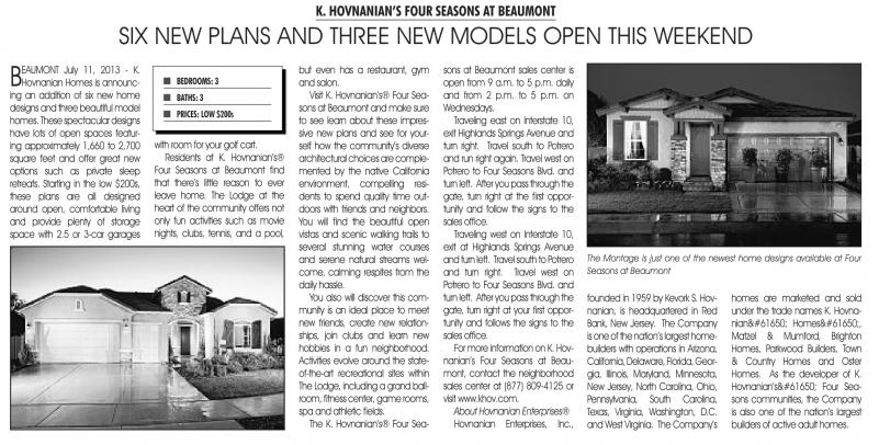 Formore information on K. Hovnanian’s Four Seasons at Beaumont, contact the neighborhood sales center at (877) 809-4125 or visit www.khov.com.
