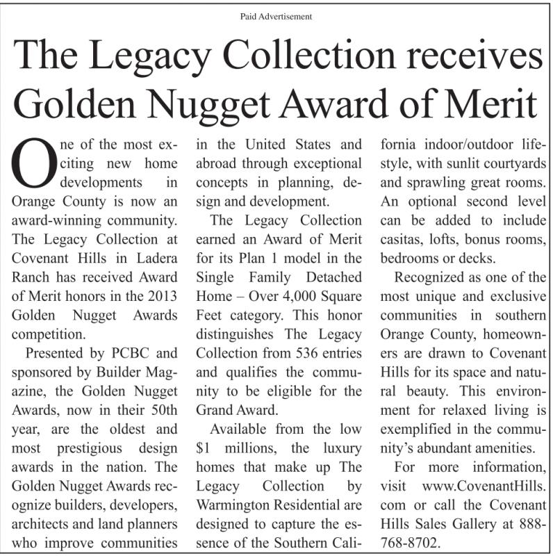 of the most exciting new home developments in Orange County is now an award-winning community. The Legacy Collection at Covenant Hills in Ladera Ranch has received Award of Merit honors in the 2013 Golden Nugget Awards competition.