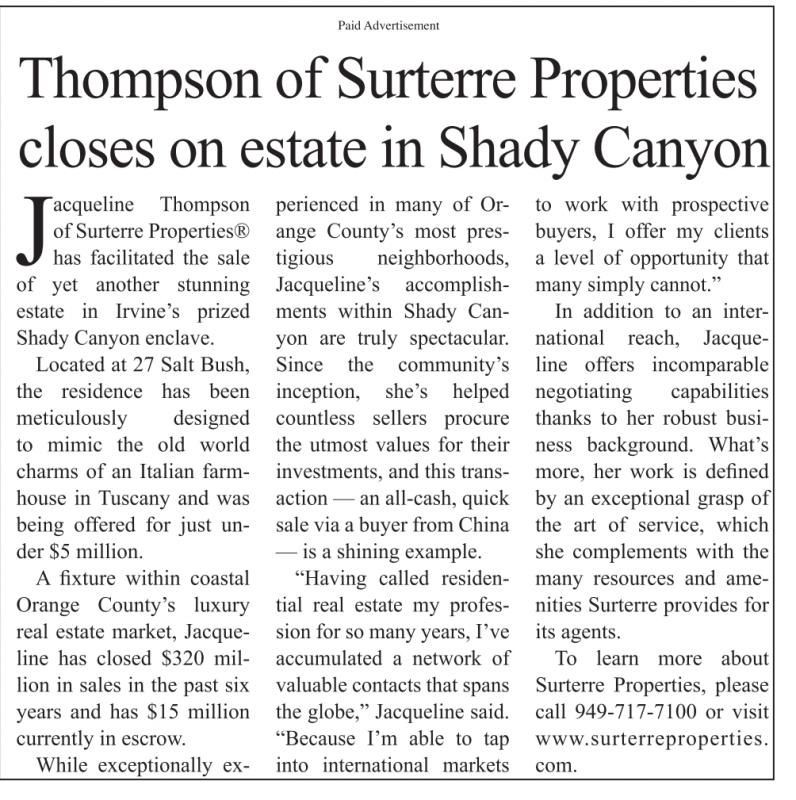 Thompson of Surterre Properties closes on estate in Shady Canyon