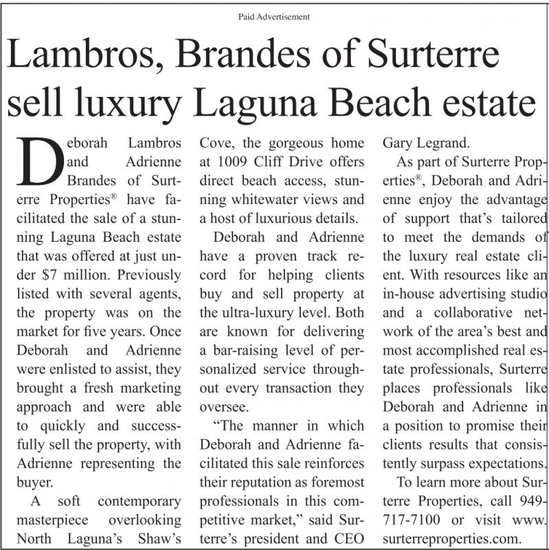 Lambros and Adrienne Brandes of Surterre Properties ® have facilitated the sale of a stunning Laguna Beach estate that was offered at just under $7 million. Previously listed with several agents, the property was on the market for five years. Once Deborah and Adrienne were enlisted to assist, they brought a fresh marketing approach and were able to quickly and successfully sell the property, with Adrienne representing the buyer.