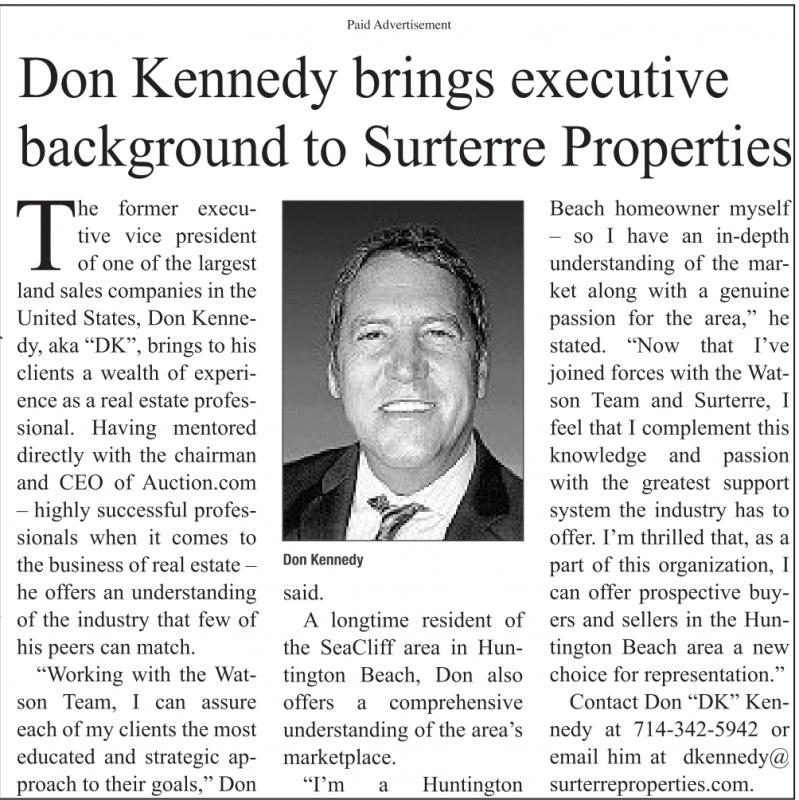 Contact Don “DK” Kennedy at 714-342-5942 or email him at dkennedy@ surterreproperties.com.