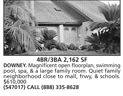 4BR/3BA 2,162 SF DOWNEY. Magnificent open floorplan, swimming pool, spa, & a large family room. Quiet family neighborhood close to mall, frwy, & schools. $610,000 (547017) CALL (888) 335-8628