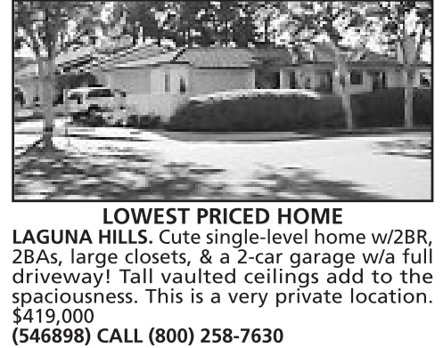LOWEST PRICED HOME LAGUNA HILLS. Cute single-level home w/2BR, 2BAs, large closets, & a 2-car garage w/a full driveway! Tall vaulted ceilings add to the spaciousness. This is a very private location. $419,000 (546898) CALL (800) 258-7630