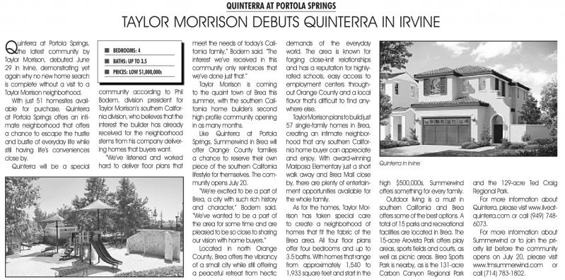 Taylor Morrison is coming to the quaint town of brea this summer, with the southern California home builder’s second high profile community opening in as many months.