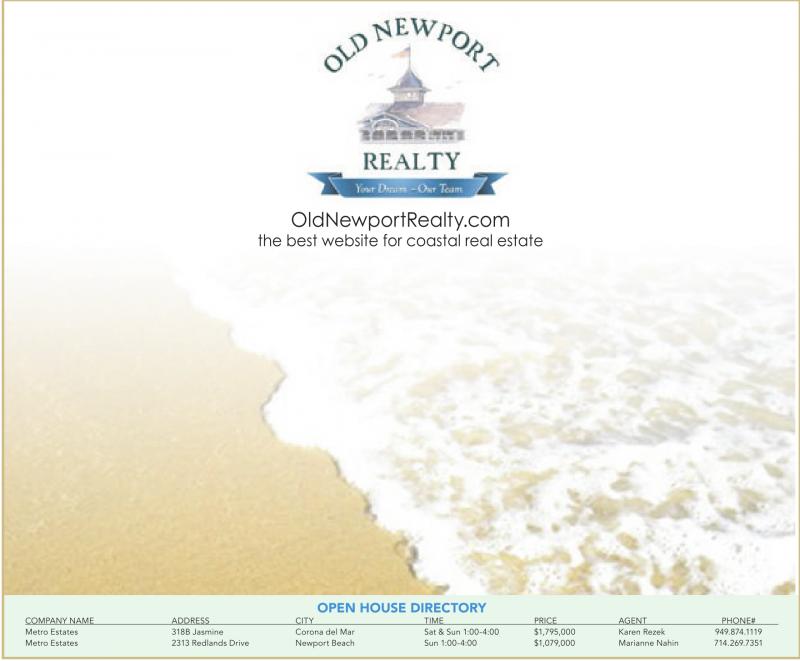 OldNewportRealty.com the best website for coastal real estate OPEN HOUSE DIRECTORY COMPANY NAME ADDRESS CITY TIME PRICE AGENT PHONE# Metro Estates 318B Jasmine Corona del Mar Sat &Sun 1:00-4:00 $1,795,000 Karen Rezek 949.874.1119 Metro Estates 2313 Redlands Drive Newport Beach Sun 1:00-4:00 $1,079,000 Marianne Nahin 714.269.7351