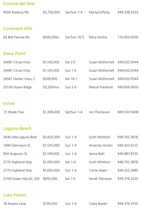 34081 Chula Vista $1,145,000 Sat 2-5 Susan McDonnell 949.632.0544 34081 Chula Vista $1,145,000 Sun 1-5 Susan McDonnell 949.632.0544 24561 Harbor View, C $549,900 Sat 10-1 Susan McDonnell 949.632.0544 33136 Ocean Ridge $3,200/mo. Sun 2-6 Marcie Friedman 949.606.6610