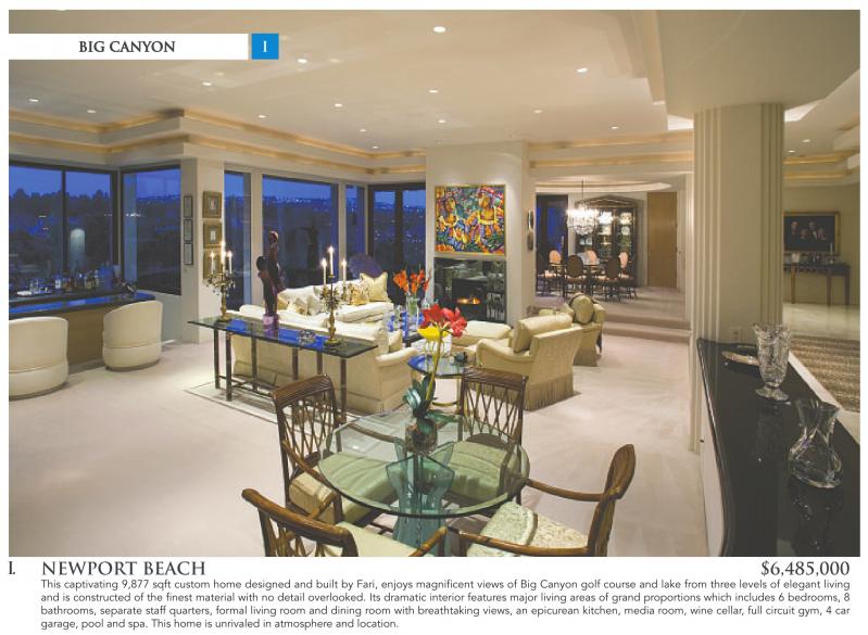 BIG CANYON BIG CANYON I I. NEWPORT BEACH $6,485,000 This captivating 9,877 sqft custom home designed and built by Fari, enjoys magnificent views of Big Canyon golf course and lake from three levels of elegant living and is constructed of the finest material with no detail overlooked. Its dramatic interior features major living areas of grand proportions which includes 6 bedrooms, 8bathrooms, separate staff quarters, formal living room and dining room with breathtaking views, an epicurean kitchen, media room, wine cellar, full circuit gym, 4 car garage, pool and spa. This home is unrivaled in atmosphere and location.
