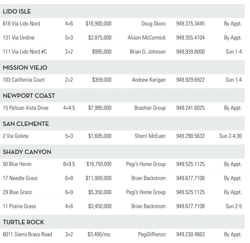 lido isle 618 ViaLido Nord 4+6 $16,900,000 Doug Skoro 949.375.3445 By Appt. 131 ViaUndine 5+3 $2,875,000 Alison McCormick 949.355.4104 By Appt. 111 ViaLido Nord #C 2+2 $995,000 Brian G. Johnson 949.939.8000 Sun 1-4 mission viejo 103 California Court 2+2 $359,000 Andrew Karigan 949.929.6922 Sun 1-4 newportcoast 15 Pelican Vista Drive 4+4.5 $7,995,000 Brashier Group 949.241.6025 By Appt. sanclemente 2Via Goleta 5+3 $1,695,000 Sherri McEuen 949.290.5633 Sun 2-4:30 shadycanyon 50 Blue Heron 8+9.5 $16,750,000 Pegi’sHome Group 949.525.1125 By Appt. 17 Needle Grass 6+8 $11,900,000 Brian Backstrom 949.677.7108 By Appt. 29 Blue Grass 6+9 $5,350,000 Pegi’sHome Group 949.525.1125 By Appt. 11 Prairie Grass 4+6 $3,450,000 Brian Backstrom 949.677.7108 Sun 2-5 turtle rock 6011 Sierra Bravo Road 3+2 $3,400/mo. PegiDiRienzo 949.230.4663 By Appt.