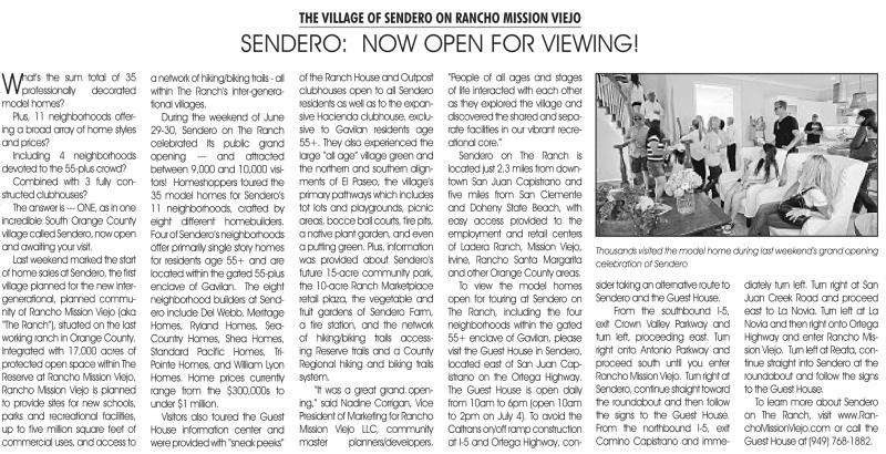 during the weekend of June 29-30, Sendero on The Ranch celebrated its public grand opening --- and attracted between 9,000 and 10,000 visitors! Homeshoppers toured the 35 model homes for Sendero’s 11 neighborhoods, crafted by eight different homebuilders. four of Sendero’s neighborhoods offer primarily single story homes for residents age 55+ and are located within the gated 55-plus enclave of gavilan. The eight neighborhood builders at Sendero include del Webb, Meritage Homes, Ryland Homes, Sea- Country Homes, Shea Homes, Standard Pacific Homes, Tri- Pointe Homes, and William Lyon Homes. Home prices currently range from the $300,000s to under $1 million.