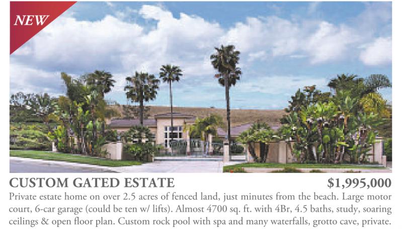 NEW CUSTOM GATED ESTATE $1,995,000 Private estate home on over 2.5 acres of fenced land, just minutes from the beach. Large motor court, 6-car garage (could be ten w/ lifts). Almost 4700 sq. ft. with 4Br, 4.5 baths, study, soaring ceilings & open floor plan. Custom rock pool with spa and many waterfalls, grotto cave, private.