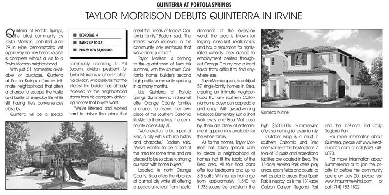 Taylor Morrison is coming to the quaint town of brea this summer, with the southern California home builder’s second high profile community opening in as many months.