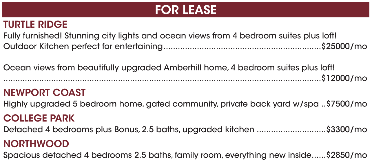 Ocean views from beautifully upgraded Amberhill home,4 bedroom suites plus loft! .....................................................................................................................................$12000/mo NEWPORT COAST Highly upgraded 5 bedroom home,gated community,private back yard w/spa ..$7500/mo COLLEGE PARK Detached 4 bedrooms plus Bonus,2.5 baths,upgraded kitchen .............................$3300/mo NORTHWOOD Spacious detached 4 bedrooms 2.5 baths,family room, everything new inside......$2850/mo