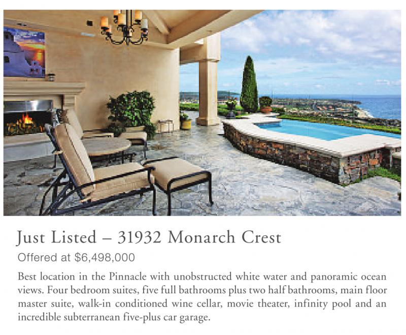 Just Listed – 31932 Monarch Crest Offered at $6,498,000 Best location in the Pinnacle with unobstructed white water and panoramic ocean views. Four bedroom suites, five full bathrooms plus two half bathrooms, main floor master suite, walk-in conditioned wine cellar, movie theater, infinity pool and an incredible subterranean five-plus car garage.