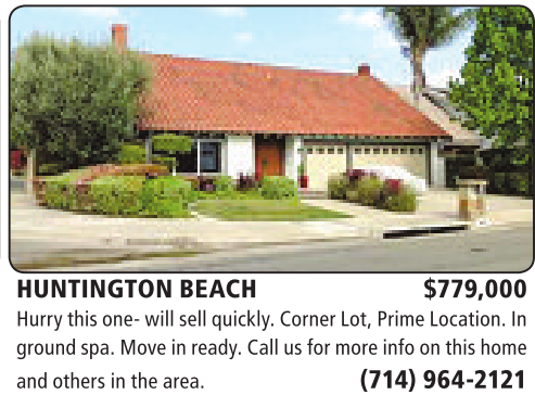 HUNTINGTON BEACH $779,000 Hurrythis one-will sell quickly.Corner Lot, PrimeLocation. In groundspa. Move in ready. Call us formore infoonthis home andothersinthe area. (714) 964-2121