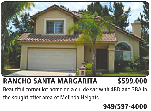 RANCHO SANTA MARGARITA $599,000 Beautifulcorner lothome on acul de sacwith4BD and3BA in thesoughtafter area of MelindaHeights 949/597-4000
