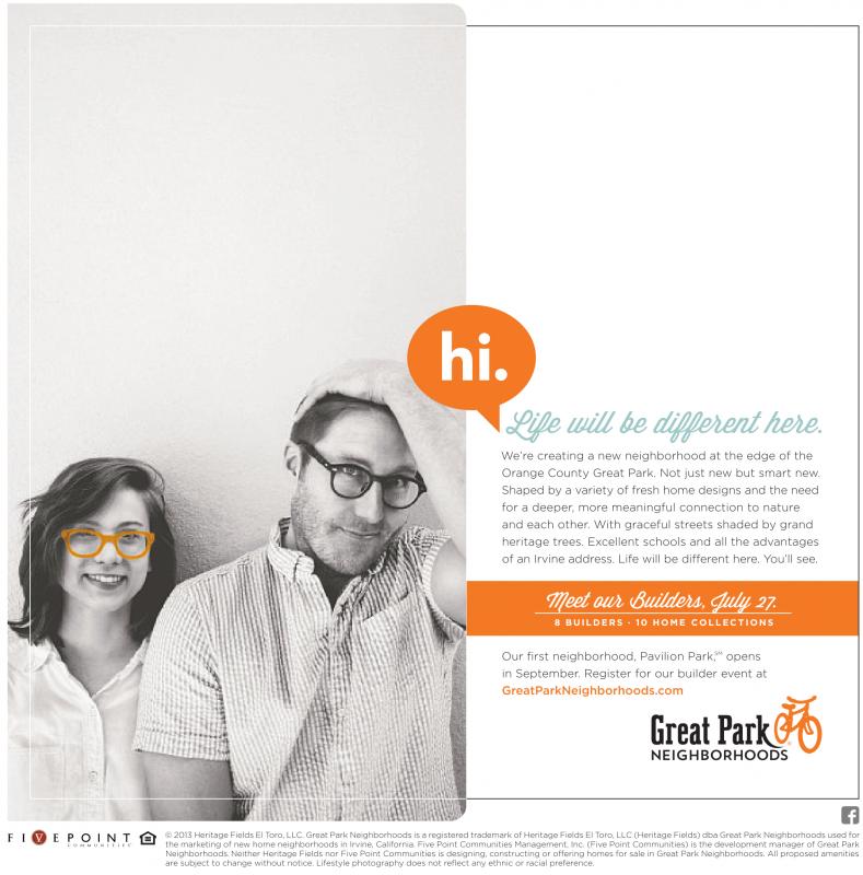 ©2013 Heritage Fields El Toro,LLC.Great Park Neighborhoods is aregisteredtrademark of Heritage Fields El Toro,LLC (Heritage Fields)dba Great Park Neighborhoods used for the marketing of new home neighborhoods in Irvine, California. Five Point Communities Management, Inc. (Five Point Communities) isthe development manager of Great Park Neighborhoods. Neither Heritage Fields nor Five Point Communities is designing, constructing or offering homes for sale in Great Park Neighborhoods. All proposed amenities are subject to change without notice. Lifestyle photography does not reflect any ethnic or racial preference.