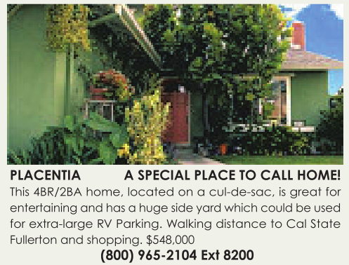 PLACENTIA ASPECIAL PLACE TO CALL HOME! This 4BR/2BA home, located on acul-de-sac, is great for entertaining and has ahuge side yardwhich could be used for extra-large RV Parking. Walking distance to Cal State Fullerton and shopping. $548,000 (800) 965-2104 Ext 8200