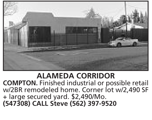 ALAMEDA CORRIDOR COMPTON. Finished industrial or possible retail w/2BR remodeled home. Corner lot w/2,490 SF + large secured yard. $2,490/Mo. (547308) CALL Steve (562) 397-9520