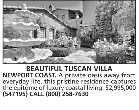 BEAUTIFUL TUSCAN VILLA NEWPORT COAST. A private oasis away from everyday life, this pristine residence captures the epitome of luxury coastal living. $2,995,000 (547195) CALL (800) 258-7630