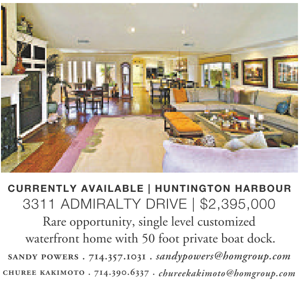 CURRENTLY AVAILABLE | HUNTINGTON HARBOUR 3311 ADMIRALTY DRIVE | $2,395,000 Rare opportunity, single level customized waterfront home with 50 foot private boat dock. sandy powers . 714.357.1031 . sandypowers@homgroup.com churee kakimoto . 714.390.6337 . chureekakimoto@homgroup.com