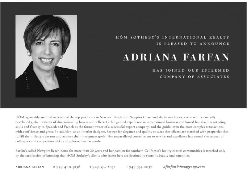 HÔM agent Adriana Farfan is one of the top producers in Newport Beach and Newport Coast and she shares her expertise with a carefully developed global network of discriminating buyers and sellers. Farfan gained experience in international business and honed her sharp negotiating skills and fluency in Spanish and French as the former owner of a successful export company, and she guides even the most complex transactions with confidence and grace. In addition, as an interior designer, her eye for elegance and quality ensures that clients are matched with properties that fulfill their lifestyle dreams and achieve their investment goals. Her unparalleled commitment to service and excellence has earned the respect of colleagues and competitors alike and achieved stellar results.