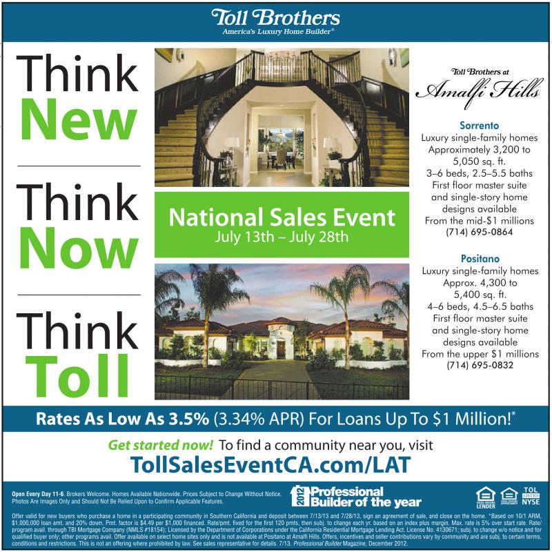 14 Think New Think Now Think To l l National Sales Event July 13th – July 28th Sorrento Luxury single-family homes Approximately 3,200 to 5,050 sq. ft. 3–6 beds, 2.5–5.5 baths First floor master suite and single-story home designs available From the mid-$1 millions (714) 695-0864 Positano Luxury single-family homes Approx. 4,300 to 5,400 sq. ft. 4–6 beds, 4.5–6.5 baths First floor master suite and single-story home designs available From the upper $1 millions (714) 695-0832 Rates As Low As 3.5% (3.34% APR) For Loans Up To $1 Million! * Get started now! To find a community near you, visit TollSalesEventCA.com/LAT Open Every Day 11-6. Brokers Welcome. Homes Available Nationwide. Prices Subject to Change Without Notice. Photos Are Images Only and Should Not Be Relied Upon to Confirm Applicable Features. Offer valid for new buyers who purchase a home in a participating community in Southern California and deposit between 7/13/13 and 7/28/13, sign an agreement of sale, and close on the home. *Based on 10/1 ARM, $1,000,000 loan amt. and 20% down. Pmt. factor is $4.49 per $1,000 financed. Rate/pmt. fixed for the first 120 pmts, then subj. to change each yr. based on an index plus margin. Max. rate is 5% over start rate. Rate/ program avail. through TBI Mortgage Company (NMLS #18154); Licensed by the Department of Corporations under the California Residential Mortgage Lending Act. License No. 4130671; subj. to change w/o notice and for qualified buyer only; other programs avail. Offer available on select home sites only and is not available at Positano at Amalfi Hills. Offers, incentives and seller contributions varybycommunity and are subj. to certain terms, conditions and restrictions. This is not an offering where prohibited by law. See sales representative for details. 7/13. Professional Builder Magazine, December 2012.